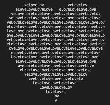 print('\n'.join([''.join([('Love'[(x-y) % len('Love')] if ((x*0.05)2+(y*0.1)2-1)3-(x*0.05)2*(y*0.1)3 <= 0 else ' ') for x in range(-30, 30)]) for y in range(30, -30, -1)]))