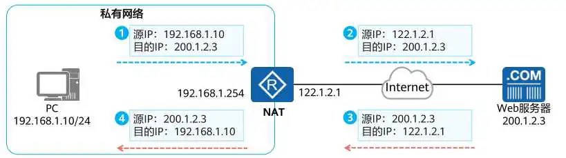 源NAT,即转换源地址的技术,这就是我们通常所说的NAT。我们平时上网的时候,设备所使用的基本都是私网地址,通常我们的需求都是“出去”访问互联网,我们的流量或者说数据的动作是“出去”。