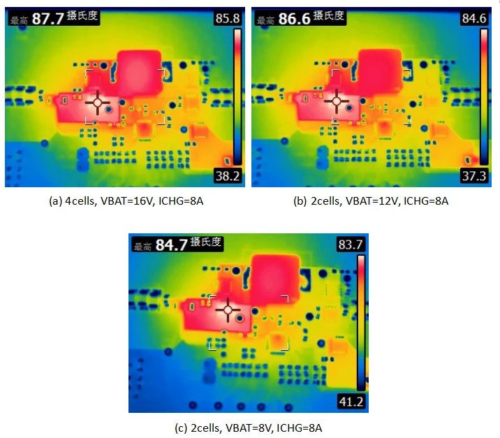 25°C环温条件下,20V输入时,4/3/2节电池在8A大电流下充电,温升分别对应62.5°C/61.6°C/59.7°C。