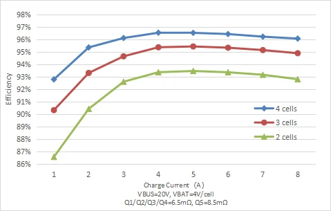 SC8885/SC8886支持高水平转换效率,从容应对65W以上功率等级的笔记本应用。在20V适配器输入下,4节电池充电效率最高可达96.5%,3节电池充电效率最高可达95.4%,2节电池充电效率最高可达93.4%。