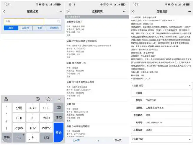 输入书名、作者等关键词检索图书的索书号、借阅状态和所在的书库,以《活着》小说为例: