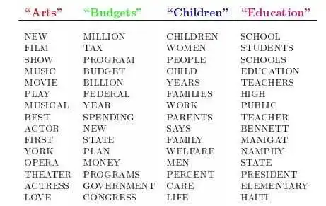 人类是怎么生成文档的呢?LDA的这三位作者在原始论文中给了一个简单的例子。比如假设事先给定了这几个主题:Arts、Budgets、Children、Education,然后通过学习的方式,获取每个主题Topic对应的词语。如下图所示: