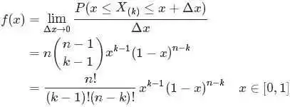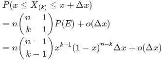 其中,o(Δx)表示Δx的高阶无穷小。显然,由于不同的排列组合,即n个数中有一个落在 [x,x+Δx]区间的有n种取法,余下n−1个数中有k−1个落在[0,x)的有