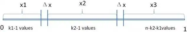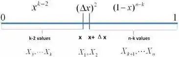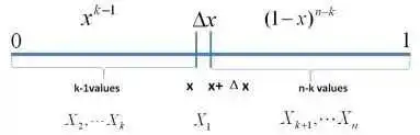 首先,把 [0,1] 区间分成三段 [0,x),[x,x+Δx],(x+Δx,1],然后考虑下简单的情形:即假设n 个数中只有1个落在了区间 [x,x+Δx]内,由于这个区间内的数X(k)是第k大的,所以[0,x)中应该有 k−1 个数,(x+Δx,1] 这个区间中应该有n−k 个数。如下图所示: