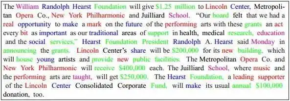 然后以一定的概率选取上述某个主题,再以一定的概率选取那个主题下的某个单词,不断的重复这两步,最终生成如下图所示的一篇文章(其中不同颜色的词语分别对应上图中不同主题下的词):