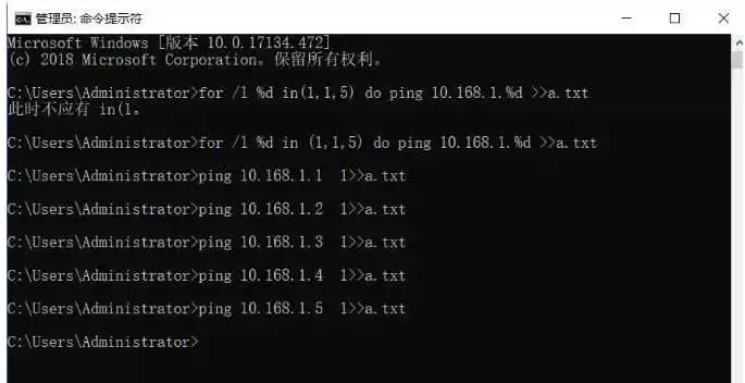 for /L %D in (1,1,255) do ping -n 10.168.1.%D >>a.txt