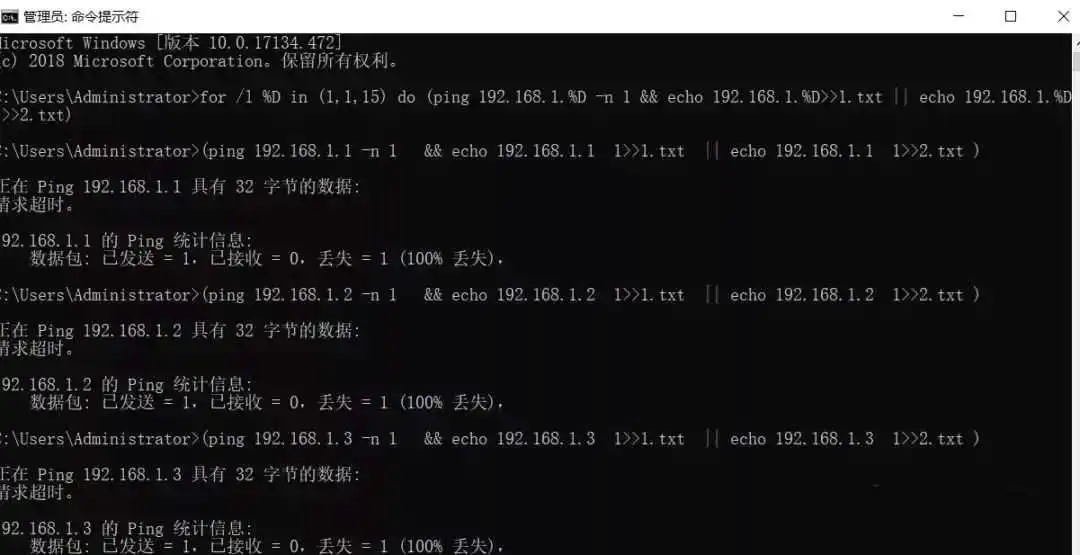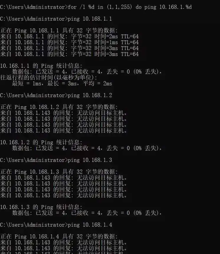 for /l %D in (1,1,255) do (ping 192.168.1.%D -n 1 && echo 192.168.1.%D>>ok.txt || echo 192.168.1.%D >>no.txt)