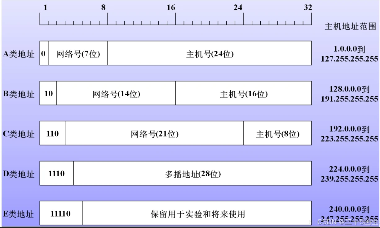 A类(8位)、B类(16位)、C类(24位)单播地址 和 D类多播地址