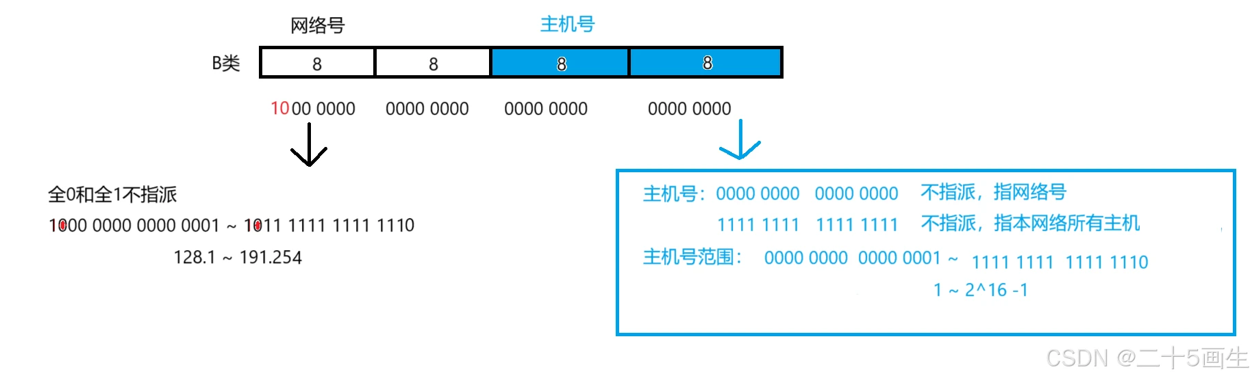 B类地址网络段有2个字节,16位,前两位固定10,实际有14位,可分配网络号:2^14-2