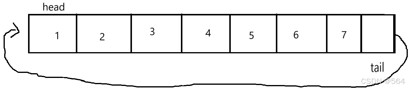 在判满时,我们知道tail指向的是最后一个数据的下一个位置, 正常情况下填满应该是如下图表示,但是这时tail+1的话数值会超出数组的下标,可能会形成越界访问的问题,因此我们要区分下面两个图中的情况,就需要分情况讨论。如果tail在0下标的位置,最后一个数据就在下标为k-1的位置,即数组的最后一个位置,这时我们如果只花了k个数组空间,那么条件与判空时相同,不容易判断出是空的还是满的,因此在判空和判满分析时,我们要多作一个空间来区分。