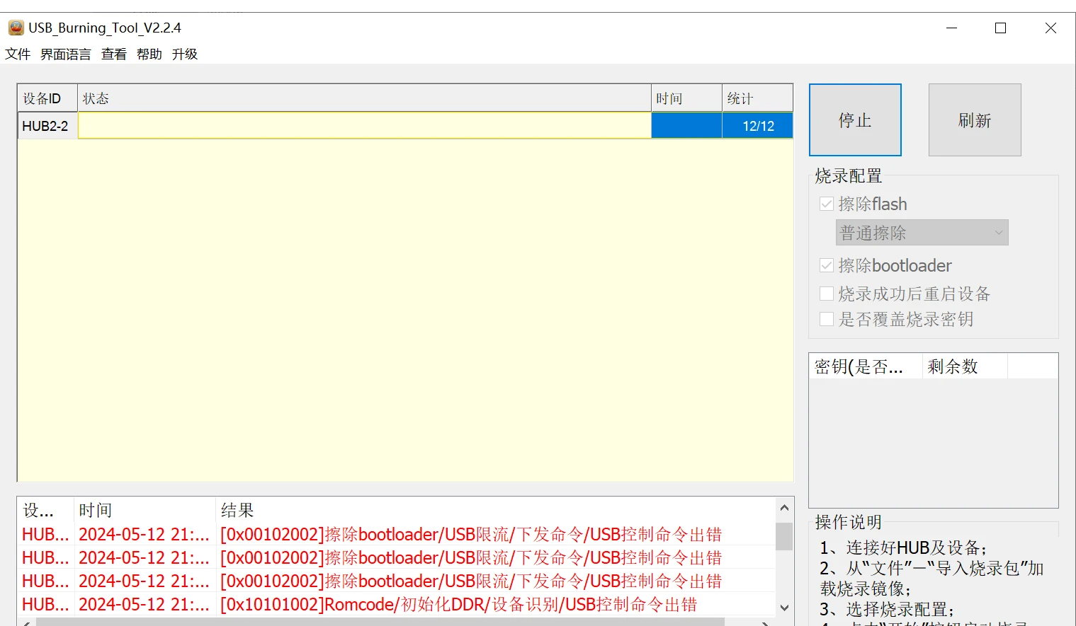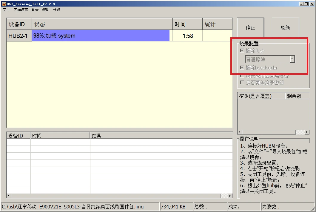 b、烧录配置:选中1, 擦除flash->普通擦除,选中2,擦除bootloader。