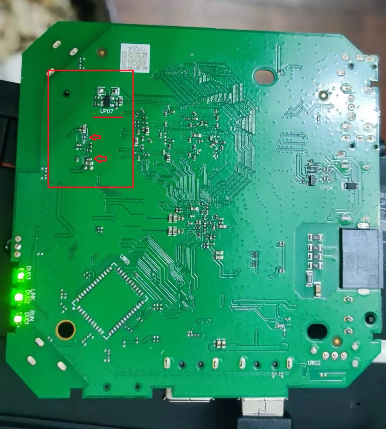 注意红框中UP07下面的两个箭头所指的两个电阻,短接任意一个就可以发出刷机信号。