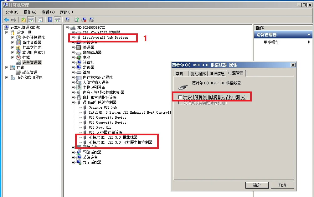 供电问题解决方案:把usb集线器、usb可扩展主机控制器两个设备的 节约电源选项取消(如图框2,框3)。
