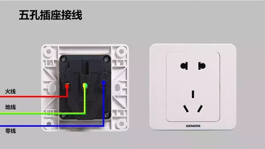 五孔插座构造非常简单,一般只需要用火线(红线)连接插座后面的L接线柱,然后用零线(蓝线)连接到N接线柱,地线(黄绿线)连接E接线柱,这样五孔插座接线就完成了。