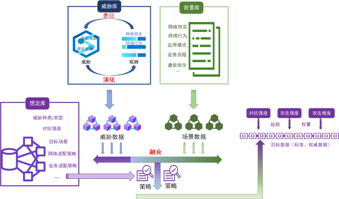 基于此,我们提出了网络空间威胁权集的概念。面向评估目标,构建并输出可定制、可量化、适配目标网络与应用场景,融合目标场景数据与网络威胁数据,为防御能力评估提供网络信流、硬件接口、系统行为、业务交互等不同观测点的不同类型数据(如网络观测点的数据为网络数据包,主机行为观测点的数据为系统调用或内核函数调用序列等),构建网络威胁数据基座。网络空间威胁权集包含三个核心要素:背景库、威胁库与想定库,如图1所示。