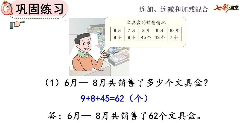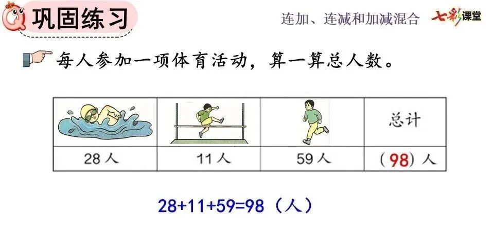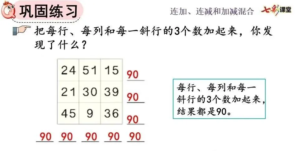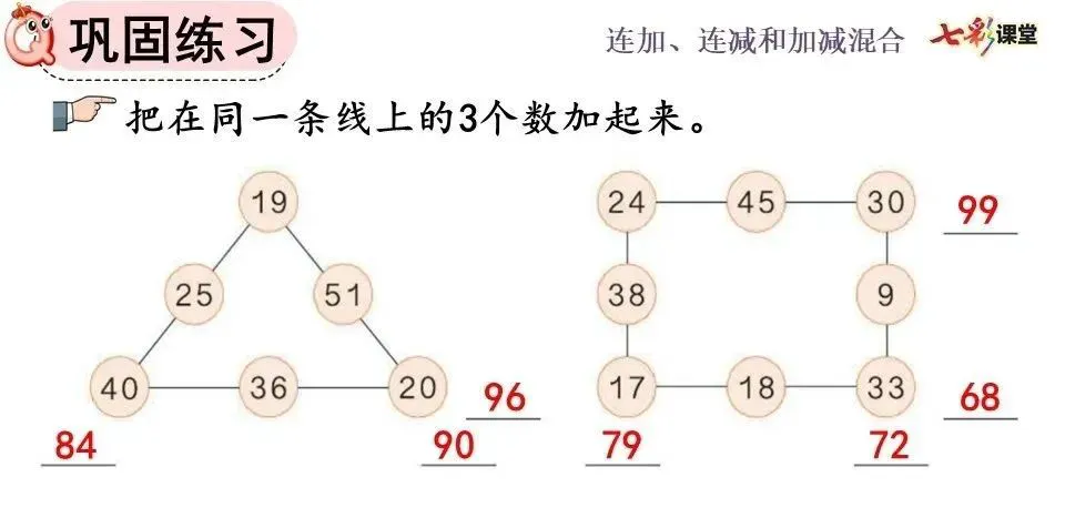 ①连加计算可以分步计算,也可以写成一个竖式计算,计算方法与两个数相加一样,都要把相同数位对齐,从个位加起。
