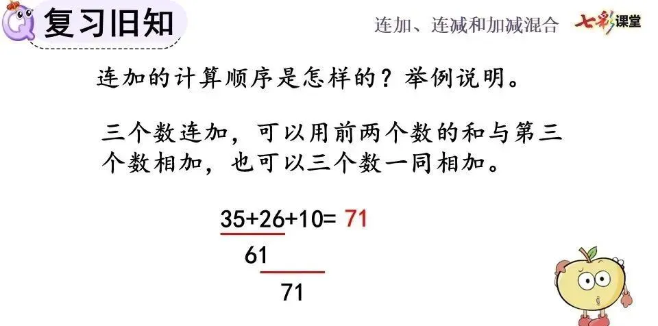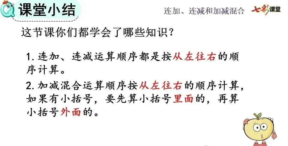 连加、连减的笔算顺序和连加、连减的口算顺序一样,都是从左往右依次计算。
