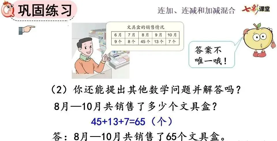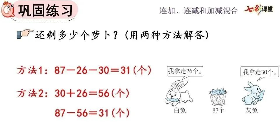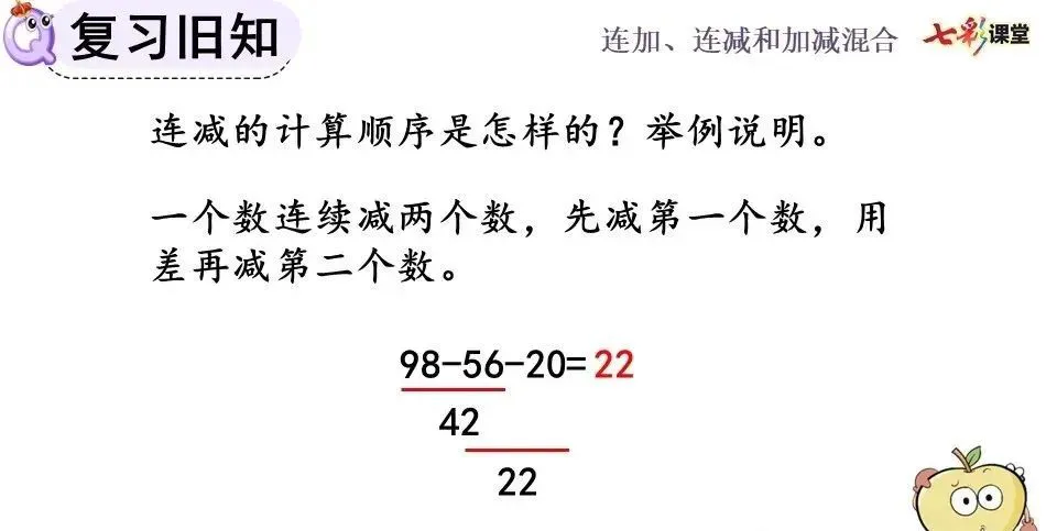 ②连减运算可以分步计算,也可以写成一个竖式计算,计算方法与两个数相减一样,都要把相同数位对齐,从个位减起。