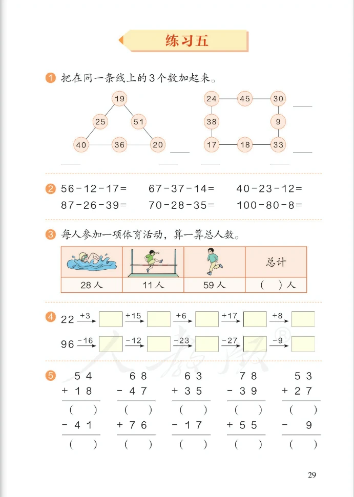 3、加减混合运算写竖式时可以分步计算,方法与两个数相加(减)一样,要把相同数位对齐,从个位算起;也可以用简便的写法,列成一个竖式,先完成第一步计算,再用第一步的结果加(减)第二个数。