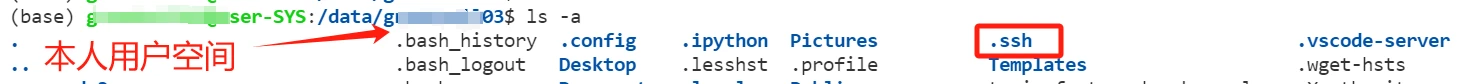 (服务器中的.ssh目录一般在自己的用户空间下,如下图所示: 它是隐藏目录,可以使用 ls -a 查看)