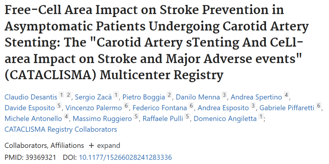 [1] Desantis C, Zacà S, Boggia P, et al. Free-Cell Area Impact on Stroke Prevention in Asymptomatic Patients Undergoing Carotid Artery Stenting: The “Carotid Artery sTenting And CeLl-area Impact on Stroke and Major Adverse events” (CATACLISMA) Multicenter Registry. Journal of Endovascular Therapy. 2024;0(0). doi:10.1177/