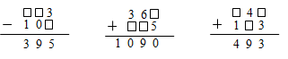【分析】根据被减数-减数=差;加数+加数=和,和整数加减法的计算方法,第一个算式,个位上3减几等于5,3比5小不能减5,肯定是从前一位借1,也就是13减几等于5,据此推算出是8;被减数的十位数字被借1后减0等于9,9减0等于9,被借1后还剩9,不借之前是10,10不能占一个数位,故被减数的十位数字是0;被减数百位数字是被借1后减1等于3,让3加1再加1等于5;第二个算式,个位,5加几等于0,没有这样的数,只有5+5等于10,个位向十位进1,6加进位的1再加几等于9,让9-6-1=2,百位上,3加几等于10,让10-3=7即可解答;第三个算式,个位几加3等于3,让3-3=0,十位上,4加几等于9,让9-4=5,百位上,加1等于4,让4-1=3,据此解答。