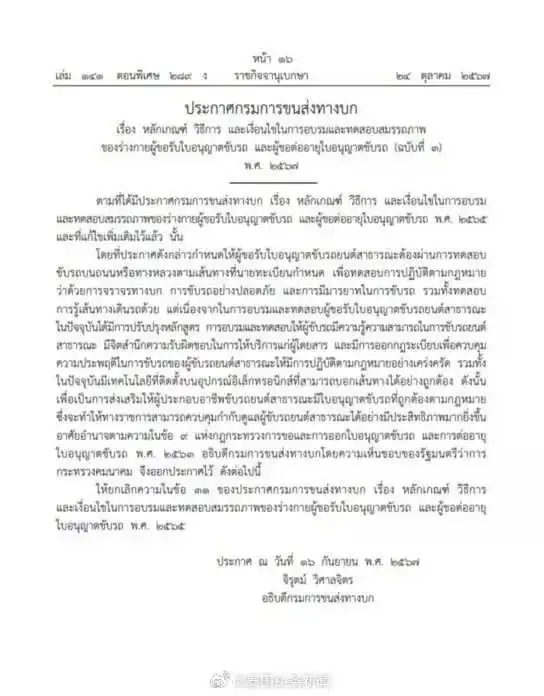 10月27日,泰国政宪公报网站发布了陆运厅2024年第3版《驾驶执照申请及更新法》,主要涉及驾驶执照申请和更换时的培训和体能测试要求,其核心内容是取消此前驾驶执照考试中的指定道路或公路测试。