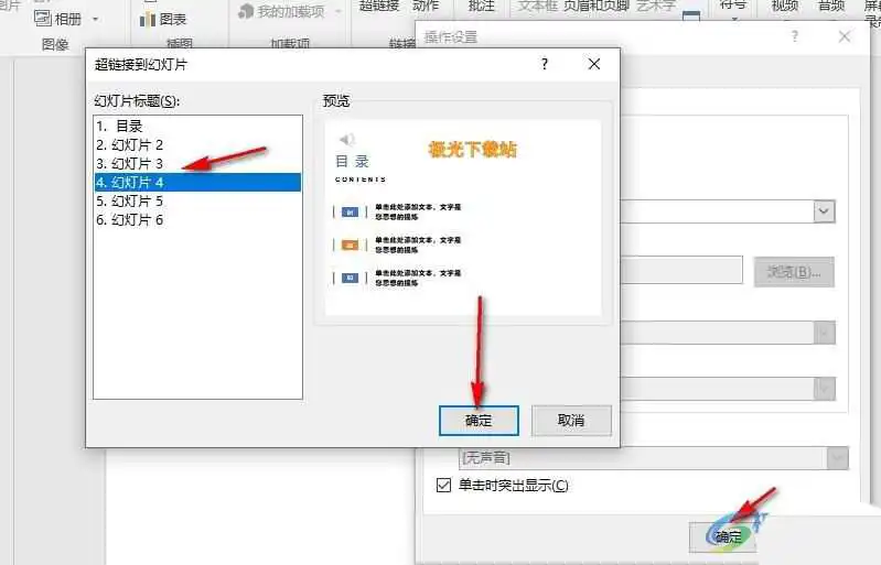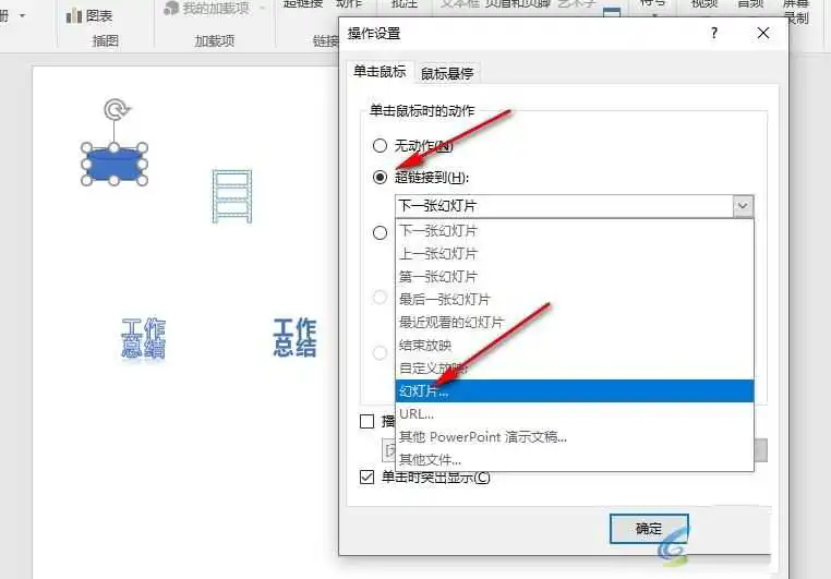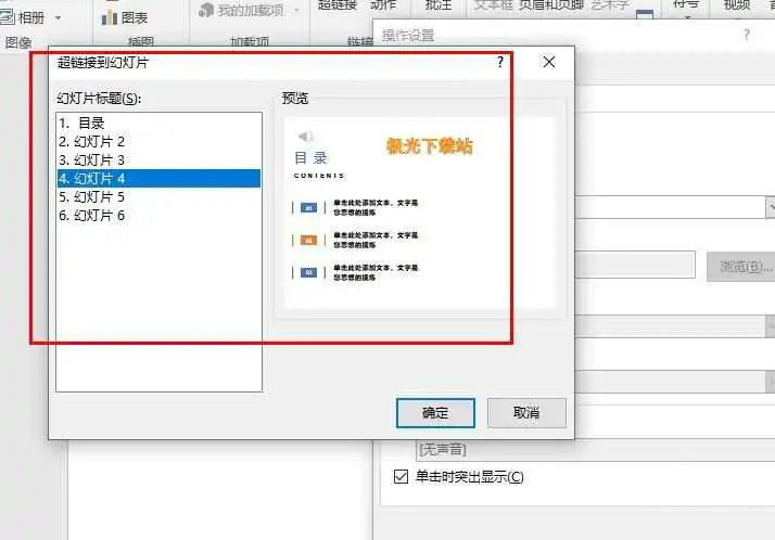 5、打开幻灯片选项之后,我们在弹框中选择一个目标幻灯片,然后点击确定选项保存设置即可