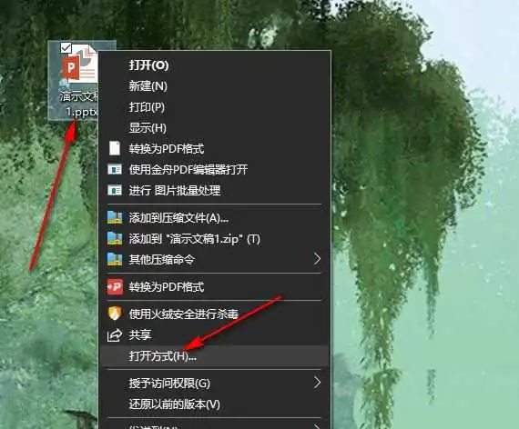 1、我们在桌面找到需要编辑的演示文稿,右键单击该演示文稿,然后先点击“打开方式”选项,再点击powerpoint选项