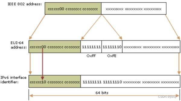 以太网的MAC地址是48位,而基于EUI-64 的地址是64位,在中间插入特定的FFFE(16位),把第7位反转,即可生成EUI-64格式的接口ID。(IEEE 802 地址的 48 位地址,此地址由 24 位公司 ID(也称为制造商 ID)和 24位扩展ID(也称为底板 ID)组成。公司 ID(唯一指派给每个网络适配器的制造商)和底板 ID(在装配时唯一指派给每个网络适配器)的组合,即可生成全局唯一的 48 位地址。这个 48 位地址也称为物理地址、硬件地址或媒体访问控制(MAC) 地址)