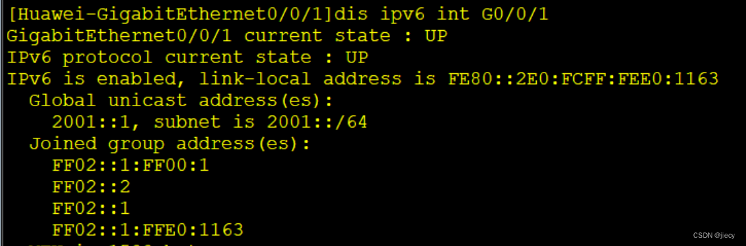 ping ipv6 fe80::1 -i G0/0/0 #同一个设备,可以多个接口配置同一个 LLA