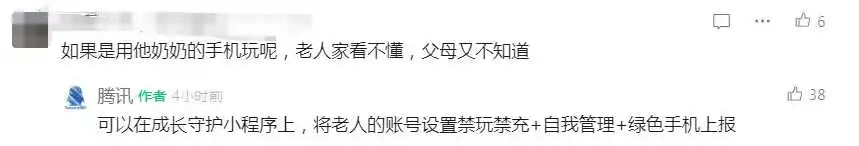 对此,很多网友表示支持,“太需要了!”“很实用的功能”“这就准备查一下”。也有网友提出疑问,“如果孩子用奶奶的手机玩怎么办,老人家看不懂,父母又不知道。”对此,腾讯方面回复称,可以在成长守护小程序上,将老人的账号设置“禁玩禁充+自我管理+绿色手机上报”。此外,还有网友表示:“如何确保输入信息的是个人本人?”腾讯方面回复称,身份证授权时候需要本人人脸验证。