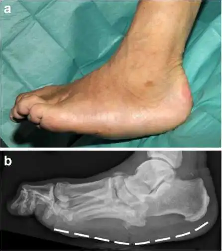 Charcot足的起始事件通常是看似微不足道的损伤,甚至在许多情况下,患者无法回忆起外伤史。患者可能会注意到脚的形状发生变化,可能会感觉到走路时脚部的骨头嘎吱作响。随后,肿胀迅速发作,足部温度升高。患者通常在疾病发生发展时痛觉不明显,继续行走活动,导致畸形、关节破坏和炎症进行性加重。Charcot足末期的典型表现是摇椅足畸形。