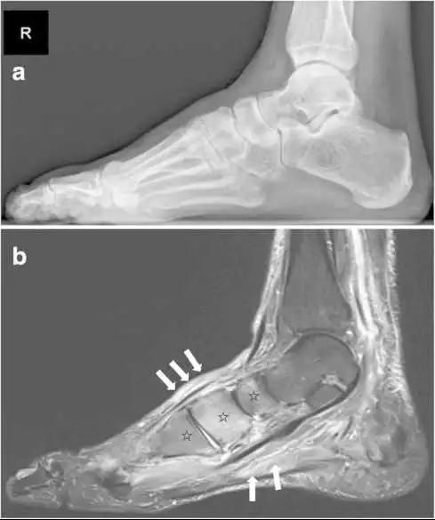 早期活动性Charcot足。a 侧位负重X光片显示无异常。b MRI显示中足典型骨髓水肿(星号)和中足软组织水肿(白色箭头)