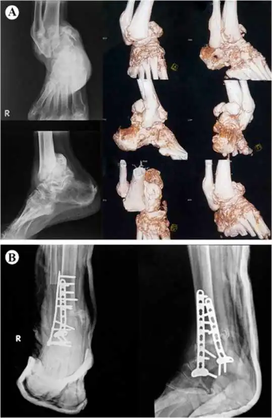 Eichenholtz分期3期、疾病趋于稳定时方可考虑手术纠正畸形。手术治疗包括清除感染骨、切除影响穿鞋或矫形器的骨突、对被破坏的关节进行关节融合术提供功能性的稳定的跖行足。