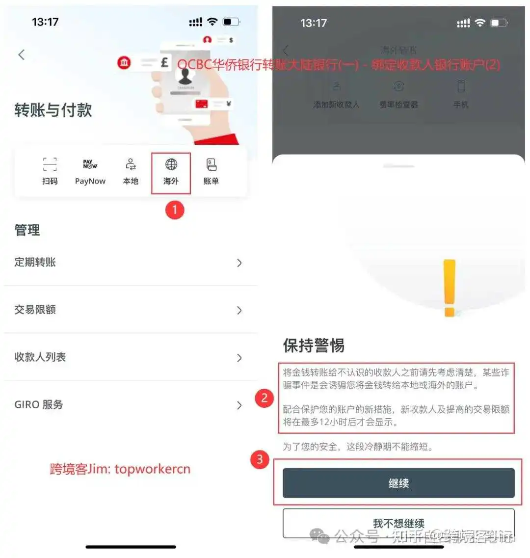 在打开的页面选择点击海外图标。因为大陆相对于新加坡来说是海外。在打开新页面之前有一个安全提示,提醒不要向陌生人转账,并且绑定的收款人在12个小时之后才能转账。