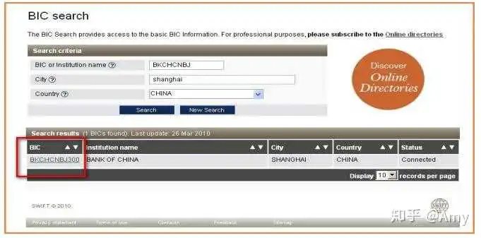 BIC or institution name 中填入中国银行的统一代码:BKCHCNBJ;City中填入您要查询的城市拼音:shanghai;