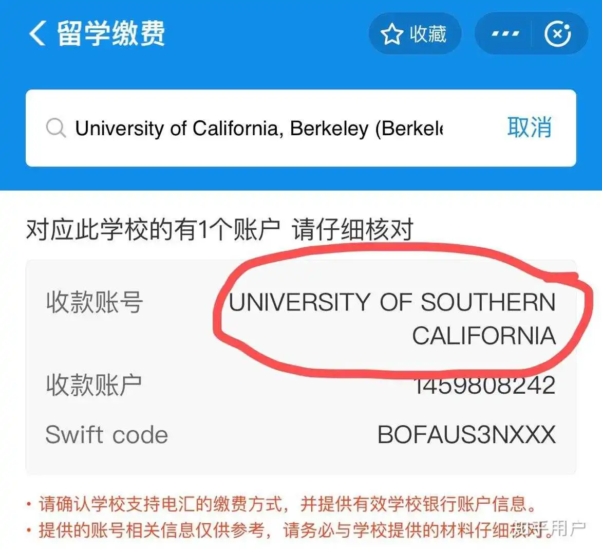 我是UCB的,8/23就要Due学费了,之前看到有手续费全免活动我就想今天还能赶得上。点开支付宝之后,翻了半天没翻到留学缴费的图标,又去翻之前营销广告的推文,搜【跨境汇款】才找到。然后我搜UCB,显示搜不到,我就又输入全称。然后我就惊呆了.....
