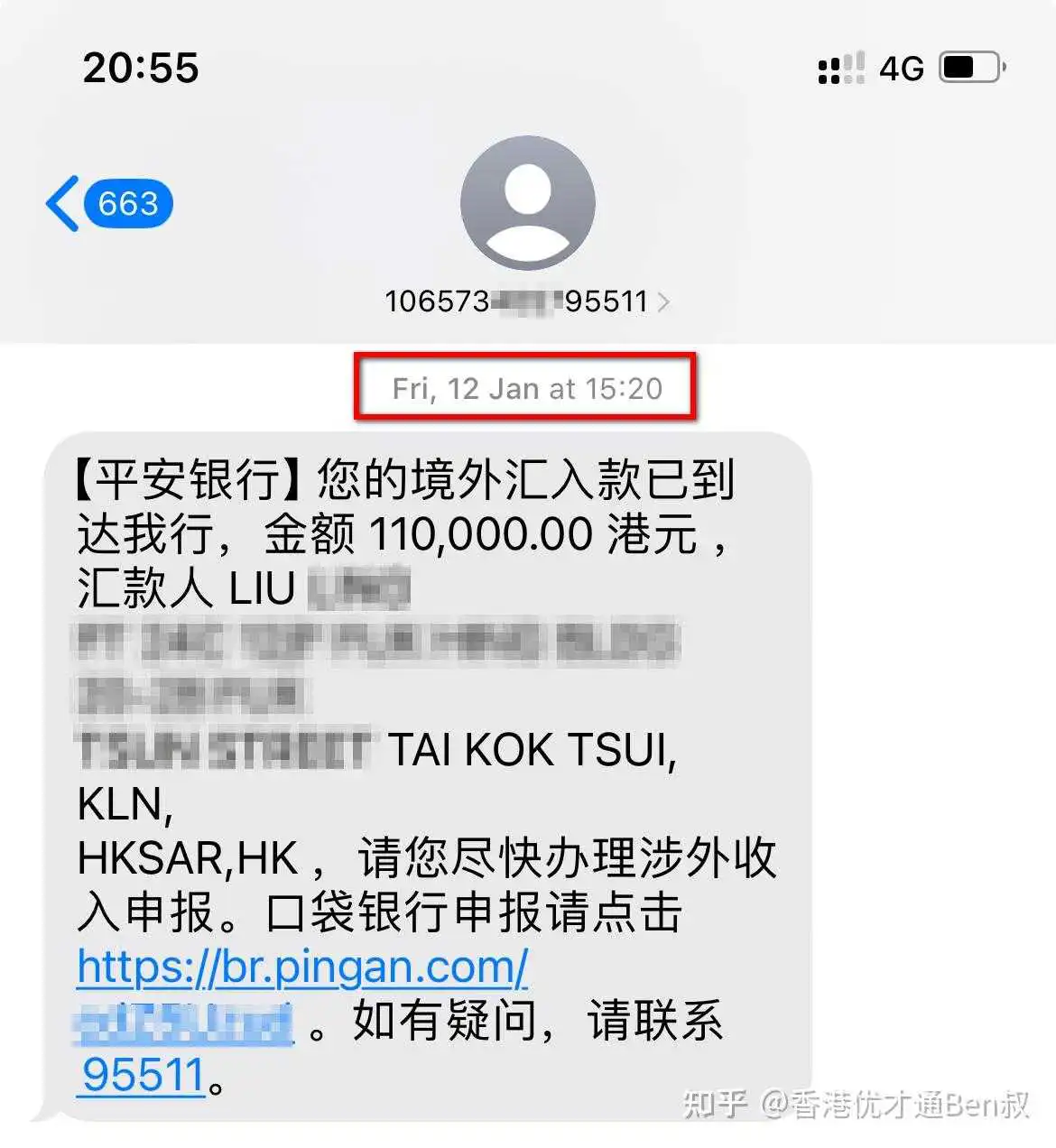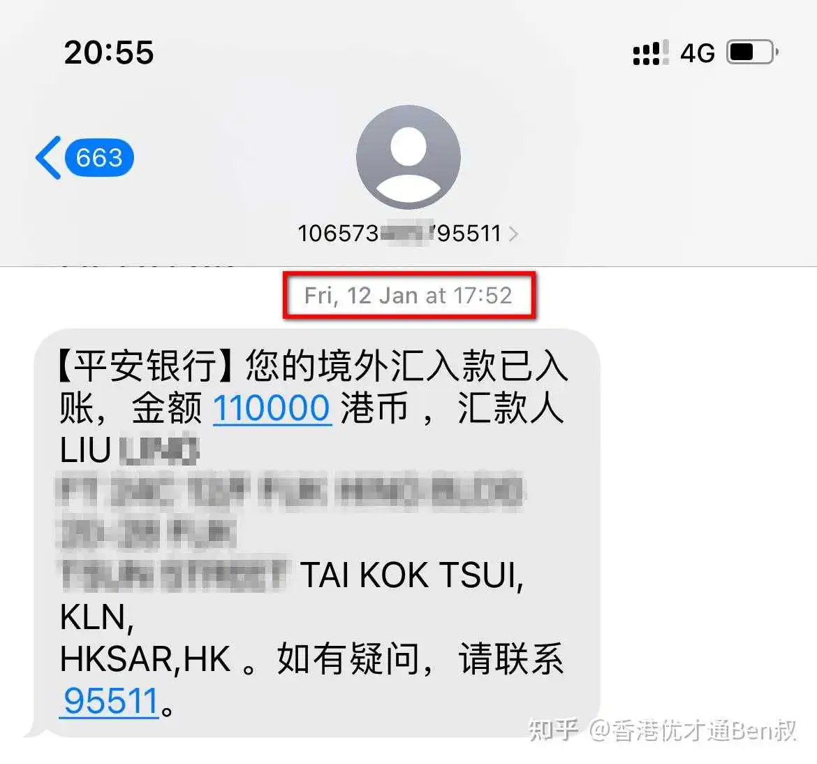 我的案例有点特殊,可能刚好赶上银行的cutoff time,竟然一个小时之后就收到了平安银行的短信通知,到达收款行了。如下图: