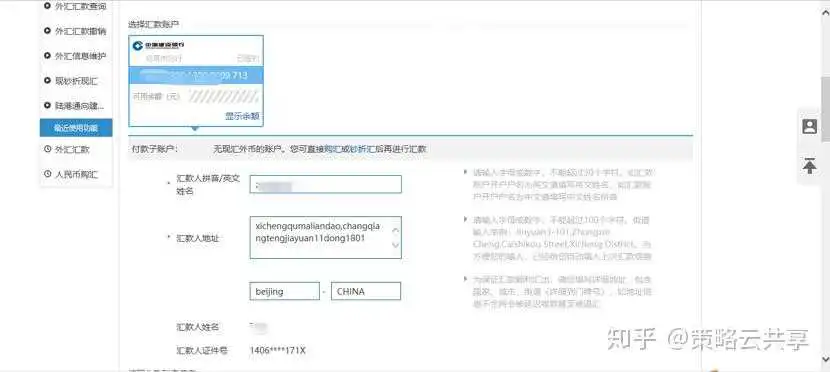 2.选择汇款账户,填写汇款信息(汇款人拼音、汇款人地址、姓名、证件等)。