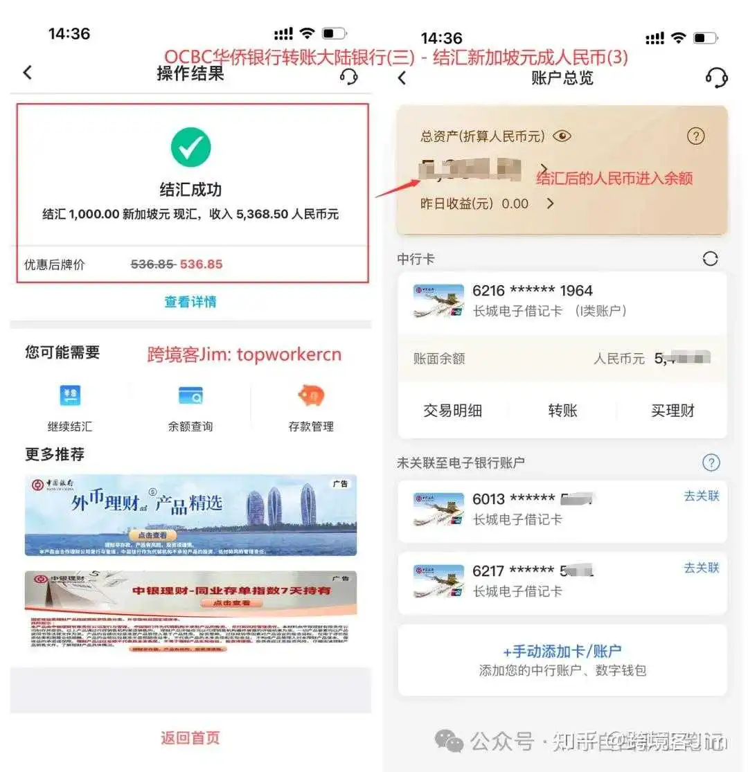 如图所示,从新加坡OCBC华侨银行转账到大陆银行的新加坡元金额结汇后的人民币金额自动进入中国银行的账户余额。