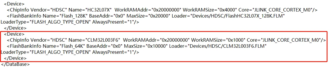 4、也是在JFLASH软件安装的位置,找到JLinkDevices.xml文件,可以用记事本打开,加上这个芯片的说明。