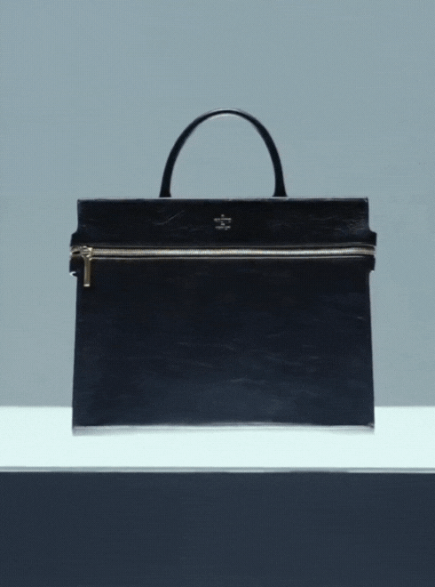 R66最妙的设计在它的截断式开口,拉链还做了飘带的延伸,如果平时通勤为了安全性考虑那可以全拉上,很轻松就能塑造出一个大女主的人设。