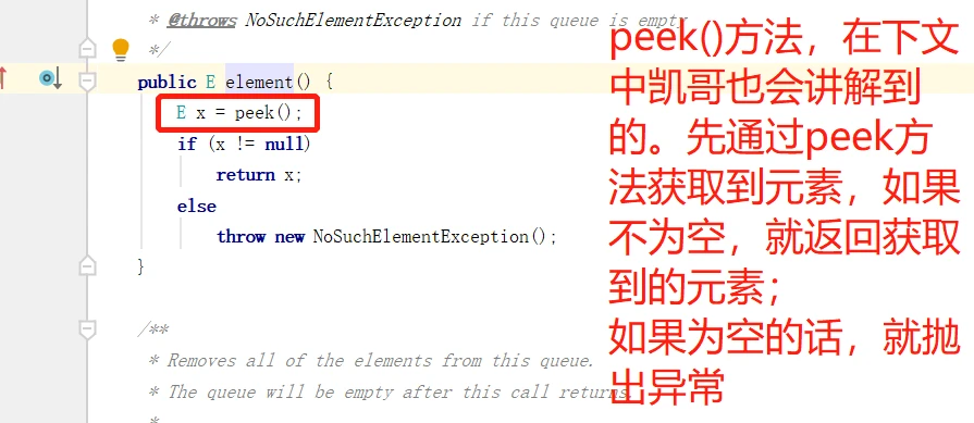 该方法是获取队首元素的。当队列不为空的时候,返回队列中当前队首元素;如果队列为空的时候,调用该方法会抛异常的。