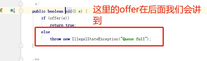 从源码中,我们可以看到,调用的是offer(e)方法,在下文中,我们也会讲解到的。如果offer方法返回true的话,就直接返回,否则就抛出:throw new IllegalStateException("Queue full");异常的。