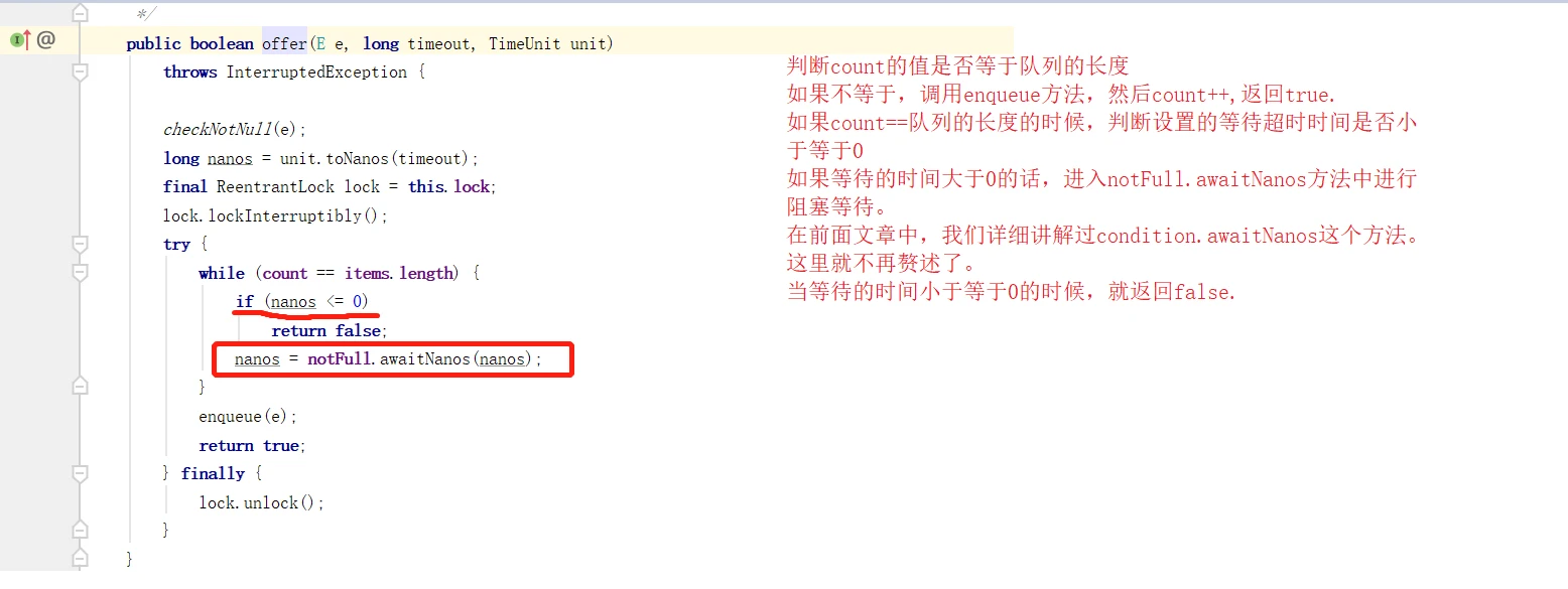 如果等待的时间大于0的话,进入notFull.awaitNanos方法中进行阻塞等待。