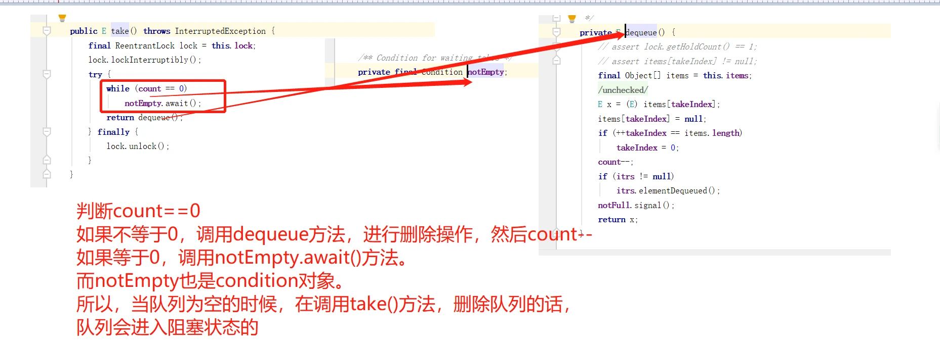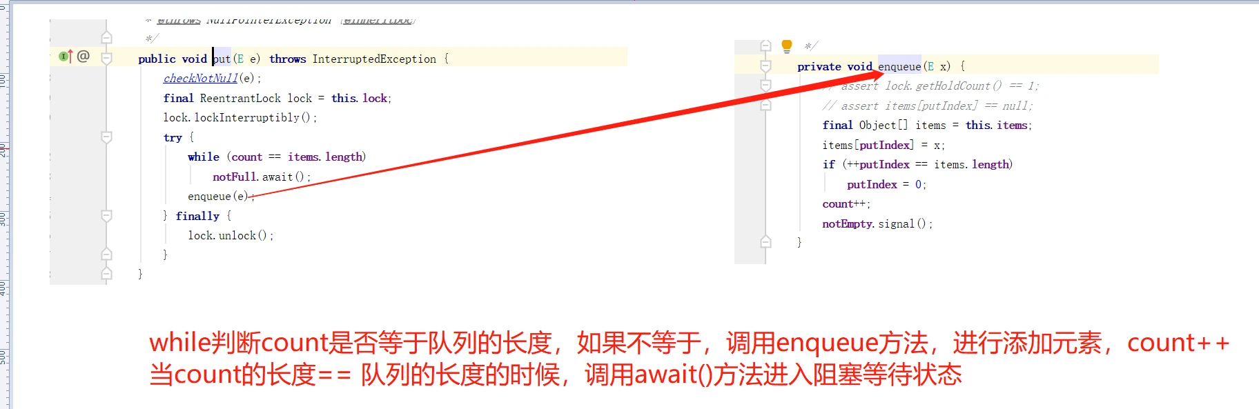 在源码中,我们会看到while循环来判断count的值是否等于队列的长度,如果不等于,就enqueue.然后count++;如果count的值等于队列的长度的是,就调用notFull.await()方法,而notfull是condition对象。在之前的文章学习中,我们知道coditon.await()方法会进入阻塞状态。源码如下图: