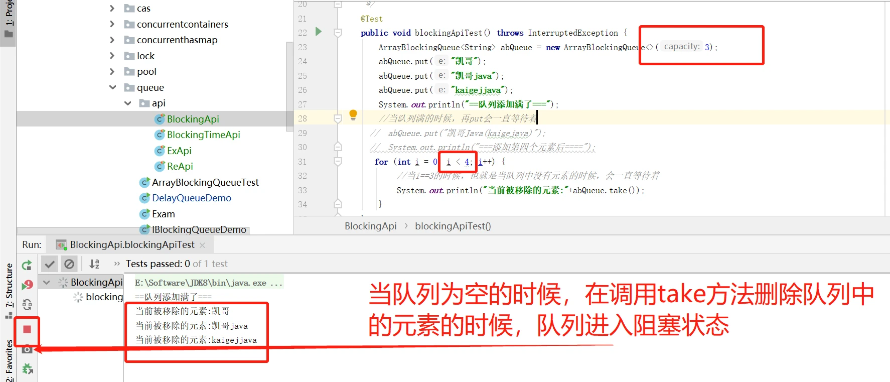 我们可以看到,当添加第四个元素的时候,队列进入了阻塞状态。如下图: