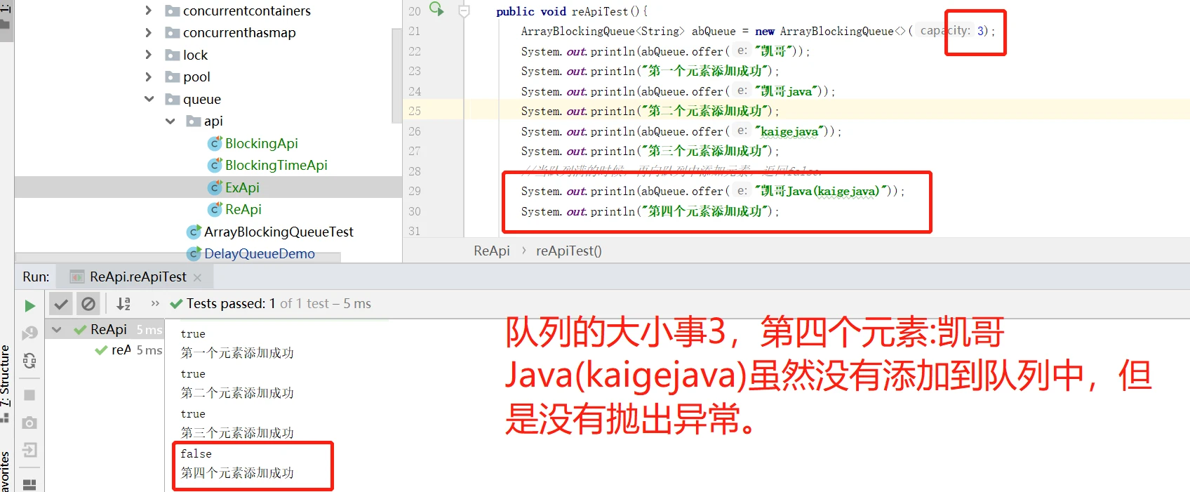 从源码中,我们可以看到,offer(e)的方法中,有个count计数器,每次添加元素后,都会count++。当count的值等于队列的长度的时候,返回false.而不是抛出异常。我们来用代码演示.