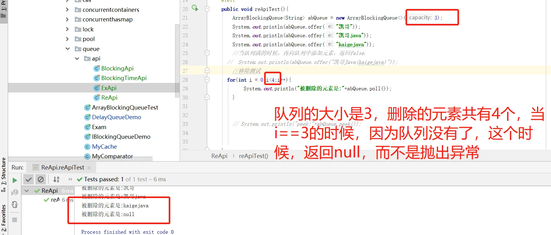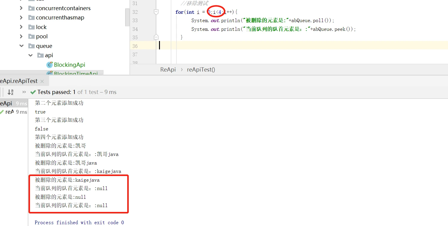 从运行的结果,我们可以看到,当移除最后一个元素:kaigejava的时候,获取到的队首元素已经为null了。因为队列为空了,所以,就算后面还有循环,获取到的队首元素依然是null,而不是抛出异常。运行结果如下图: